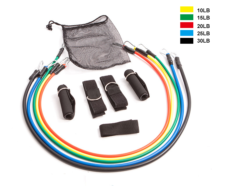5 * elastic bands: black (30 lbs), blue (25 lbs), red (20 lbs), green (15 lbs), yellow (10 lbs)